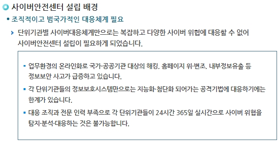 대응조직과 전문인력 부족으로 각 단위기관들이 24시간 365일 실시간으로 사이버위협을 탐지, 분석, 대응하는 것은 불가능한데요 그에따라 사이버안전센터 설립이 필요하게 되었습니다.