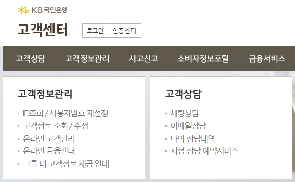 고객정보관리 메뉴에서는 아이디조회, 사용자암호 재설정, 고객정보조회 및 수정, 온라인 고객관리, 온라인 금융센터, 그룹내 고객정보 제공안내를 합니다. 고객상담 메뉴에서는 채팅상담, 이메일상담, 나의상담내역, 지점상담 예약서비스를 이용할 수 있어요.