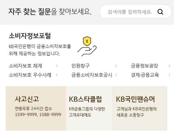 검색창에 검색어를 입력하열 자주찾는 질문을 찾아볼 수 있으며, 소비자정보포털은 KB국민은행이 금융소비자보호를 위하여 제공하는 정보입니다.