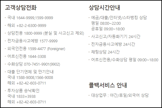 고객상담 전화번호에 대한 모든것은 위의 그림을 참고하시구요, 야간이나 휴일 및 외국어상담의 경우 콜백서비스도 제공하고 있습니다. 상담시간은 예금/대출/인터넷/스타뱅킹의 경우 평일 08시~22시 및 공휴일 09시~18시까지입니다. 사고신고, 자동화기기, 전자금융사고예방, 채팅상담은 24시간 가능하며 어르신전용 및 수화상담은 평일 09시부터 18시까지 이용하실 수 있습니다.