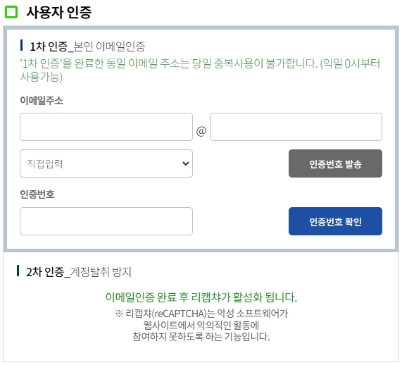1차 인증은 본인 이메일인증이며, 1차 인증을 완료한 동일 이메일 주소는 당일 중복사용이 불가하고 익일 0시부터 사용하실 수 있습니다. 2차 인증은 계정탈취 방지를 위함이며, 이메일인증 완료 후 리캡챠가 활성화됩니다. 리캡챠는 악성 소프트웨어가 웹사이트에서 악의적인 활동에 참여하지 못하도록 하는 기능입니다.