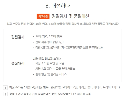 품질개선을 위해서는 핵심 소모품 확인과 교환, 차량 흠집제거, 광택, 실내항균 및 클리닝을 실시합니다. 핵심 소모품의 경우 3개월 보장을 하고, 상용의 경우 승용과 전체 점검영역은 동일 및 상세항목은 다소 차이가 있습니다.