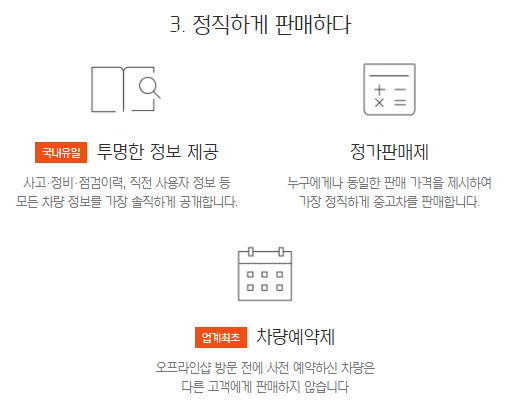 사고, 정비, 점검이력, 직전 사용자 정보 등 모든 차량정보를 가장 솔직하게 공개하고 누구에게나 동일한 판매가격을 제시하여 가장 정직하게 중고차를 판매합니다. 또한 오프라인샵 방문전에 사전예약을 진행한 차량은 다른 고객에게 판매하지 않습니다.