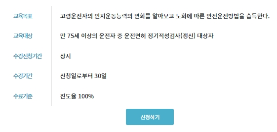 교육목표는 고령운전자의 인지운동능력 변화를 알아보고 노화에 따른 안전운전방법을 습득하는 것입니다. 교육대상은 만 75세 이상의 운전자 중에서 운전면허 적기적성검사 및 갱신 대상자이며, 수강신청기간은 상시입니다. 수강기간은 신청일로부터 30일이고, 수료기준은 진도율 100%입니다.