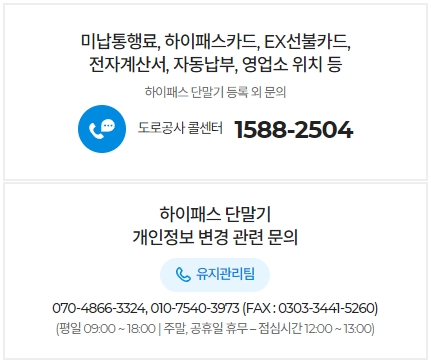 미납통행료, 하이패스카드, EX선불카드, 전자계산서, 자동납부, 영업소 위치 등 하이패스 단말기 등록 외 문의는 도로공사 콜센터로 하시면 됩니다. 하이패스 단말기 개인정보 변경 관련 문의는 유지관리팀으로 할 수 있으며, 운영시간은 평일 09시~18시까지이고, 점심시간은 12시~13시까지입니다. 주말과 공휴일은 휴무입니다.
