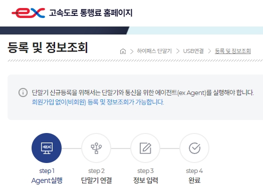고속도로 통행료 홈페이지에 접속하여 하이패스 단말기, USB연결, 등록 및 정보조회 메뉴순으로 들어가시면 됩니다. 단말기 신규등록을 위해서는 단말기와 통신을 위한 에이전트를 실행해야 하며, 회원가입 없이 비회원 등록 및 정보조회를 하실 수 있습니다. 단계별로 보시면 Agent 실행, 단말기 연결, 정보 입력, 완료순입니다.