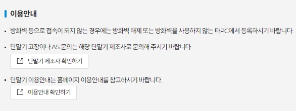 방화벽 등으로 접속이 되지 않는 경우에는 방화벽 해제 또는 방화벽을 사용하지 않는 타 PC에서 등록해주세요. 단말기 고장이나 AS문의는 해당 단말기 제조사로 문의해주시고, 이용안내는 홈페이지를 참고하시기 바랍니다.