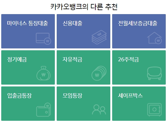카카오뱅크의 다른상품 아홉가지도 추천하고 있는데요 마이너스 통장대출, 신용대출, 전월세보증금대출, 정기예금, 자유적금, 26주적금, 입출금통장, 모임통장, 세이프박스가 있습니다. 저같은 경우에는 현재 모임에 하나 들어놓은게 있어서 모임통장을 요긴하게 잘 사용하고 있네요.