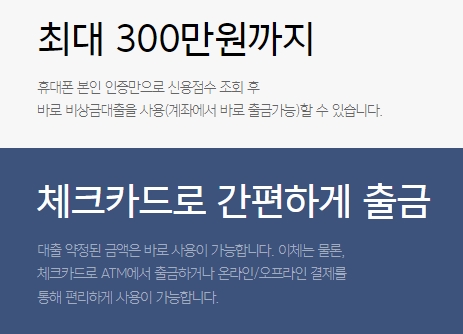 어쨌든 최대 3백만원까지 신청할 수 있고, 휴대폰 본인인증만으로 신용점수 조회후 바로 비상금대출을 사용할 수 있으며, 계좌에서 바로 출금이 가능합니다. 체크카드로도 간편하게 출금할 수 있으며, 대출 약정된 금액은 곧바로 사용이 가능합니다. 이체는 물론이고 체크카드로 ATM에서 출금하거나 온라인 및 오프라인 결제를 통하여 편리하게 사용하실 수 있습니다.