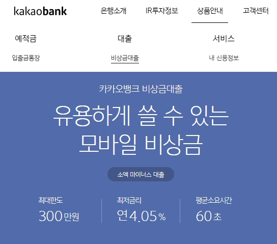 상품에 대한 더욱 자세한 안내를 확인하기 위해서는 카카오뱅크 홈페이지 주소를 찾아서 접속해야 합니다. 홈화면 상단에 있는 [상품안내] 메뉴를 선택하고 [대출] 영역에 있는 [비상금대출] 항목을 선택합니다. 최대한도는 300만원까지이고, 최저금리는 연 4.05%부터이며, 평균소요시간은 60초입니다.