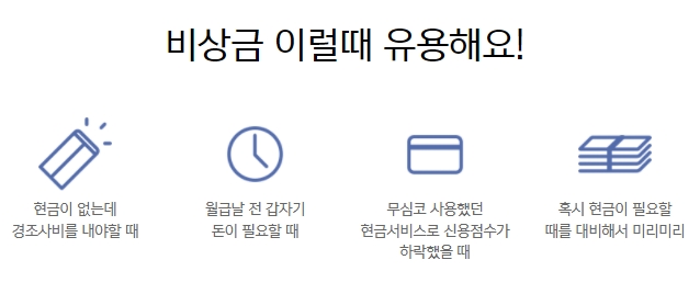 어떤 상황에서 이용할 수 있는지 예시가 네가지로 안내되어 있습니다. 현금이 없는데 경조사비를 내야할때, 월급날 전 갑자기 돈이 필요할때, 무심코 사용했던 현금서비스로 신용점수가 하락했을때, 혹시 현금이 필요할때를 대비하여 미리미리 준비할 수 있다고 하네요.