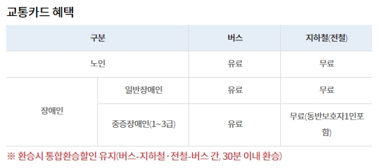 교통카드 혜택으로는 노인의 경우 버스는 유료이고 지하철은 무료입니다. 장애인은 일반장애인의 경우 버스는 유료이고 전철은 무료입니다. 중증장애인인 1~3급은 버스는 유료 그리고 지하철은 동반보호자 1인을 포함하여 무료입니다. 환승시에는 통합환승할인이 유지됩니다.