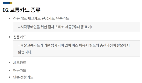 교통카드의 종류도 여러가지가 있습니다. 신용, 체크, 현금, 단순카드는 시각장애인을 위한 점자 스티커가 제공되고 우대용이 표기됩니다. 신용카드는 후불교통카드가 기본으로 탑재되어 있기때문에 버스 이용시 별도로 충전하지 않으셔도 됩니다.