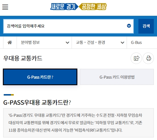 경기도청에서 안내하는 어르신 교통카드 또는 노인 교통카드에 대해서 살펴보겠습니다. 검색엔진 또는 포털사이트 등을 활용하여 사이트 바로가기를 통할 수 있는데요, 우대용 교통카드로 G-Pass카드가 있습니다.