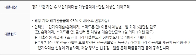 언제 어디서나 PC나 모바일로 편리하게 이용할 수 있고, 대출을 받아도 보험혜택을 그대로 유지할 수 있습니다. 대출을 하거나 상환을 할 때 수수료가 없으며, 대상은 장기보험 가입 후 보험계약대출 가능금액이 5만원 이상인 고객입니다. 한도는 해당계약 해지환급금의 95% 이내이고, 추후에 변동이 가능합니다. 인터넷 보험계약대출 이용시 채널별 1일 최대 5천만원 한도이고, 채널별 대출합산금액은 1일 최대 1억원 한도입니다.