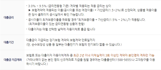 대출기간은 대출금이 지급되는 장기보험 계약의 보험계약 만료일까지이고, 순수보장성 상품 등 일부는 대출만기가 보험의 만기보다 짧을 수 있습니다. 지급계좌는 보험료 또는 대출이자 자동이체계좌 중 최근 2년 이내 이체실적이 3회 이상인 계약자 본인명의 계좌만 가능합니다.