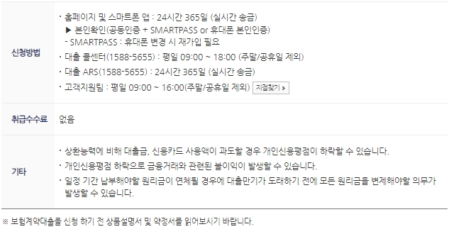 신청은 홈페이지, 스마트폰앱, 콜센터, ARS, 고객지원팀을 통하여 가능하고 취급수수료는 없습니다. 상환능력에 비하여 대출금이나 신용카드 사용액이 과도할 경우 개인신용평점이 하락할 수 있으며, 그로인해서 금융거래와 관련된 불이익이 발생할 수 있습니다.