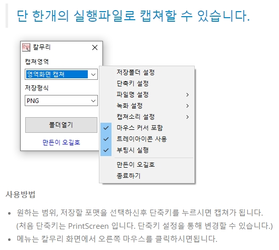 처음 단축키는 PrintScreen이지만, 단축키 설정을 통하여 변경이 가능합니다. 메뉴는 칼무리 화면에서 오른쪽 마우스를 클릭하시면 됩니다.
