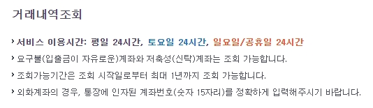 입출금이 자유로운 요구불계좌와 저축성 신탁계좌를 조회할 수 있습니다. 조회가능기간은 조회시작일로부터 최대 1년까지 가능하며, 외화계좌의 경우 통장에 인자된 계좌번호 숫자 15자리를 정확히 입력해주셔야 합니다.