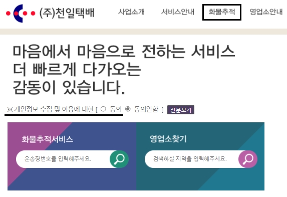 오늘은 천일택배 배송조회 또는 화물추적하는 방법에 대해서 말씀드리겠습니다. 해당 택배사 홈페이지에 접속하여 메인화면 상단에 있는 [화물추적] 메뉴를 선택합니다. 개인정보 수집 및 이용에 대하여 동의해주시고 화물추적서비스를 이용하시면 되겠습니다. 운송장번호를 입력하여 조회하거나, 검색할 지역을 입력하여 영업소를 찾을 수 있어요.
