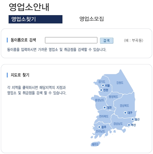 영업소안내의 경우 별도의 페이지가 존재하는데요, 영업소찾기와 모집메뉴가 있습니다. 동이름을 입력하시면 가까운 영업소 및 취급점을 검색할 수 있어요. 또는 지도로도 찾을 수 있는데,
