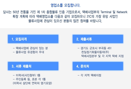 자격은 택배사업에 관심이 있는 분이며, 물류사업 유경험자를 우대합니다. 서류제출은 경기도 군포시 부곡동 451 천일정기화물자동차 택배사업본부 및 각 지역 택배지점에서 하실 수 있습니다. 사진을 첨부한 이력서 1통과, 주민등록 등초본 각 1통이 있어야 하고, 이력서 상단에 연락처를 기재하셔야 합니다. 문의처는 각 지역 택배지점입니다.