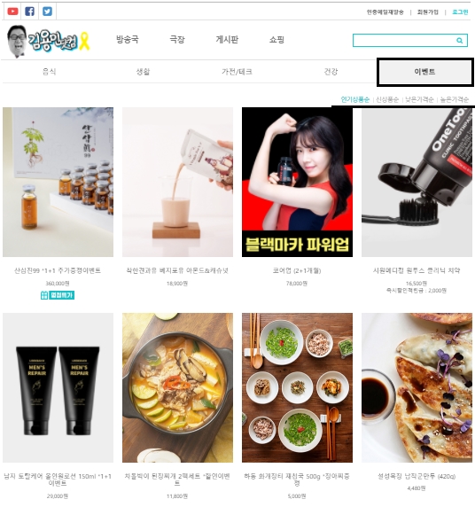김용민닷컴이라는 사이트도 운영하고 있는데요 방송국, 극장, 게시판, 쇼핑 카테고리가 있습니다. 이번시간에는 쇼핑영역에서 이벤트상품을 찾아보도록 하겠습니다. 정렬은 인기상품순, 신상품순, 낮은가격순, 높은가격순으로 할 수 있습니다.