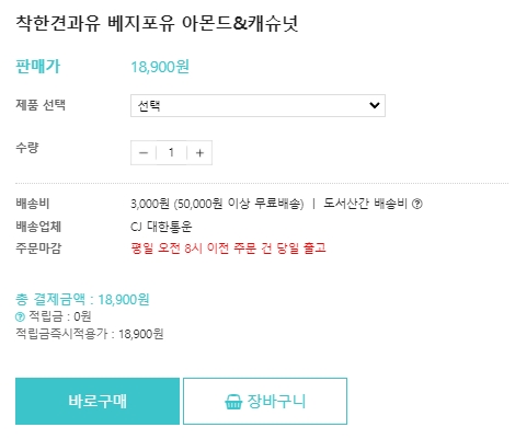 다음은 착한견과유 베지포유 아몬드&캐슈넛입니다. 현재 판매가는 18900원인데 배송비가 3천원이네요. 다만 5만원 이상 구매시 무료배송을 지원합니다. 배송업체는 CJ대한통운이고, 주문마감은 평일 오전 8시 이전 주문건에 대하여 당일출고합니다. 오늘은 이렇게 두가지 상품에 대해서만 살펴보았는데요, 이외에도 다양한 상품들이 있으니 여러분들도 필요한 제품이 있다면 천천히 둘러보시기 바랍니다.