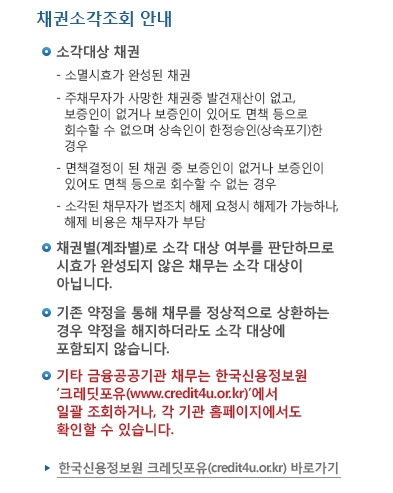 채권별로 소각대상 여부를 판단하기에 시효가 완성되지 않는 채무는 소각대상이 아니며, 기존약정을 통하여 채무를 정상적으로 상환하는 경우 약정일 해지하더라도 소각대상에 포함되지 않습니다. 기타 금융공공기관 채무는 한국신용정보원 크레딧포유에서 일괄조회하거나 각 기관 홈페이지에서도 확인이 가능합니다.