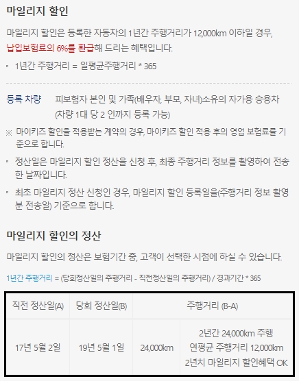 마일리지 할인은 등록한 자동차의 1년간 주행거리가 12000km 이하일 경우 납입보험료의 6%를 환급해드리는 혜택인데요, 1년간 주행거리는 일평균주행거리에 365를 곱하여 계산합니다. 등록차량은 피보험자 본인 및 가족소유의 자가용 승용차이고, 차량 1대당 2인까지 등록할 수 있습니다. 마일리지 할인정산은 보험기간 중 고객이 선택한 시점에 할 수 있습니다.