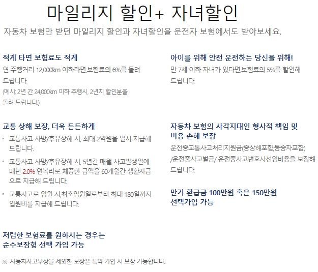 만 7세 이하의 자녀가 있다면 보험료의 5%를 할인해주며, 자동차 보험의 사각지대인 형사적 책임 및 비용손해를 보장합니다. 운전중교통사고처리지원금, 운전중사고벌금, 운전중사고변호사선임비용을