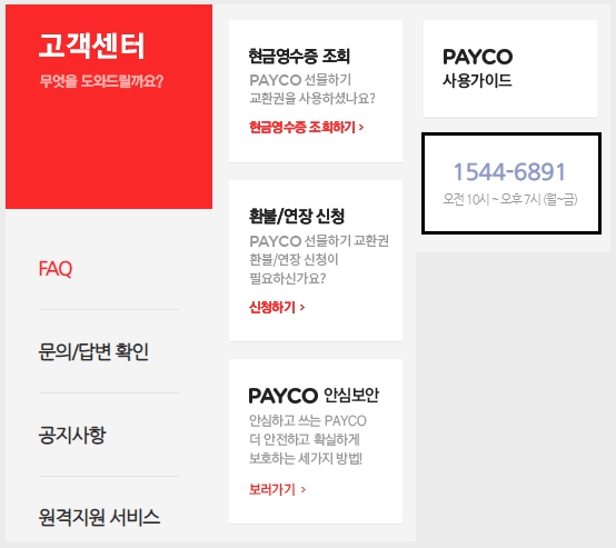 사용가이드를 확인해볼 수 있고, PAYCO 선물하기 교환권을 사용했다면 현금영수증 조회하기도 가능합니다. 페이코 선물하기 교환권 환불 및 연장신청이 필요하신 분들은 환불/연장신청을 할 수 있으며, 페이코를 더 안전하고 확실하게 보호하는 세가지 방법에 대해서도 확인할 수 있습니다. FAQ, 문의/답변확인, 공지사항, 원격지원 서비스 메뉴들도 있으니 같이 참고하시기 바랍니다.