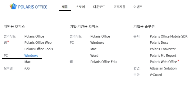 그럼 우선 해당 서비스를 제공하는 홈페이지에 접속해보도록 하겠습니다. [제품] 메뉴를 선택하시면 개인용 오피스, 기업/기관용 오피스, 기업용 솔루션 카테고리를 확인할 수 있습니다. 각각에 대하여 클라우드, 웹, PC, 모바일, 문서, 협업, 보안으로 구분해서 제품소개가 되어있으니 참고하세요.