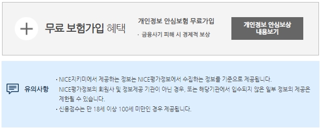 NICE지키미에서 제공하는 정보는 NICE평가정보에서 수집하는 정보를 기준으로 제공되며, NICE평가정보의 회원사 및 정보제공 기관이 아닌경우나 해당기관에서 입수되지 않은 일부정보의 제공은 제한될 수 있습니다. 또한 신용점수는 만18세 이상 100세 미만인 경우에 제공됩니다.