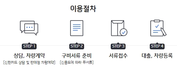 이용절차는 네가지 단계로 구성되어 있습니다. 먼저 상담 및 차량계약을 진행하는데요, 신한카드 상담 및 판매전 차량계약을 합니다. 다음은 구비서류 준비를 해야하며, 신용도에 따라서 무서류도 가능합니다. 3단계는 서류접수, 4단계는 대출 및 차량등록입니다.