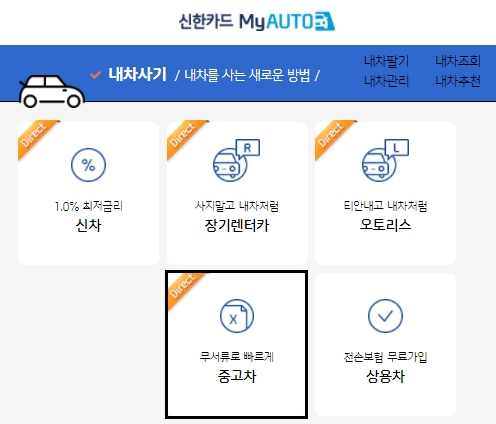 오늘은 신한카드 MyAUTO 홈페이지에 접속해서 중고자동차 대출상품에 대하여 알아보려고 합니다. 중고차 이외에도 신차, 장기렌터카, 오토리스, 상용차 메뉴가 있으니 같이 참고하시면 좋을 것 같습니다.