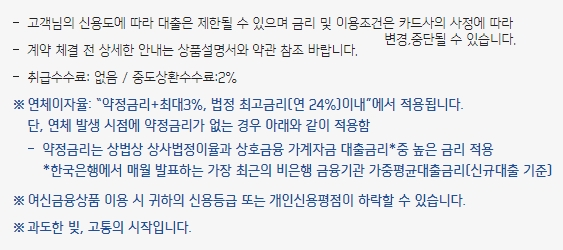 고객의 신용도에 따라 대출이 제한될 수 있으며, 금리 및 이용조건은 카드사의 사정에 따라서 변경되거나 중단될 수 있습니다. 계약체결 전 상세한 안내는 상품설명서와 약관을 참조하시고, 취급수수료는 없으며 중도상환수수료는 2%입니다. 연체이율은 약정금리에 최대 3%까지 추가되며, 법정 최고금리인 연20% 이내에서 적용됩니다.