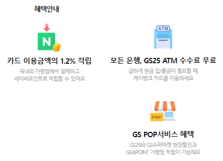 Kbank 페이지에 접속해서 네이버페이 체크카드2 상품을 찾아보았습니다. 혜택안내를 보시면 카드 이용금액의 1.2%를 적립할 수 있습니다. 국내외 가맹점에서 결제하고 네이버포인트로 적립할 수 있어요. 모든 은행 및 GS25 ATM 수수료 무료혜택도 있는데요, 급하게 입출금이 필요할때 케이뱅크 카드를 이용해보세요. GS POP 서비스 혜택도 있으며 GS25 및 슈퍼마켓 현장할인과 지에스앤포인트 가맹점 적립이 가능합니다.