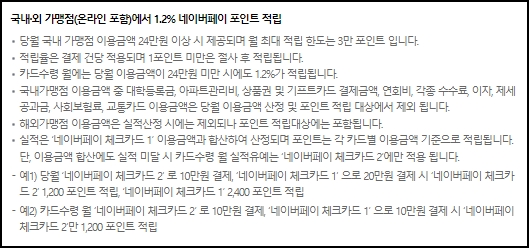 카드수령 월에는 당월 이용금액이 24만원 미만시에도 1.2%가 적립되며, 당월 이용금액 산정 및 포인트 적립대상 예외항목이 존재합니다. 해외가맹점 이용금액은 실적산정시에는 제외되지만 포인트 적립대상에는 포함됩니다.