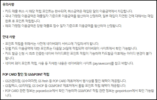 포인트 적립을 위해서는 사전에 네이버페이 서비스에 가입되어 있어야 하고, 당월 카드 이용금액에 대한 포인트는 다음달 24이리에 적립되며, 네이버페이 사이트에서 확인하실 수 있습니다. 카드발급 신청시 최초인증한 네이버 아이디로만 포인트 적립을 할 수 있고, 카드발급 이후에는 아이디를 변경할 수 없습니다. 포인트 적립이나 사용 등에대한 자세한 내용은 네이버페이 사이트를 참고하세요.