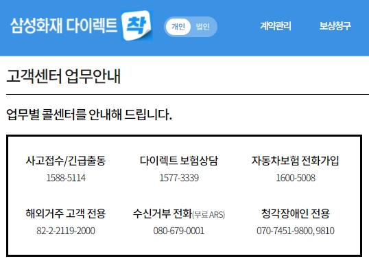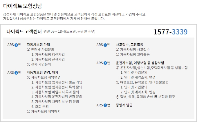 사고접수, 긴급출동, 다이렉트 보험상담, 자동차보험 전화가입, 해외거주 고객전용, 수신거부 전화, 청각장애인 전용에 대한 전화번호 안내가 되어있어요. 삼성화재 다이렉트 보험상품은 인터넷 전용이므로 고객이 직접 보험료를 계산하고 가입하셔야 합니다.