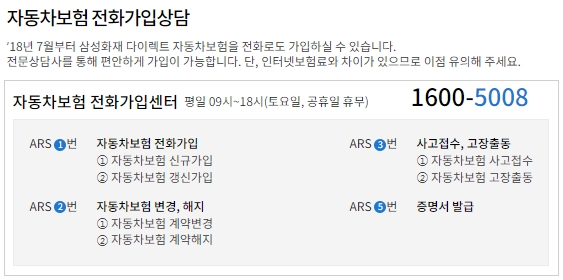2018년 7월부터는 삼성화재 다이렉트 자동차보험을 전화로도 가입할 수 있는데요, 전문상담사를 통해서 편안하게 가입이 가능합니다. 다만 인터넷보험료와 차이가 있기때문에 이 점은 유의해주세요. 자동차보험 전화가입센터 운영시간은 평일 09시부터 18시까지이고, 토요일과 공휴일은 쉽니다.