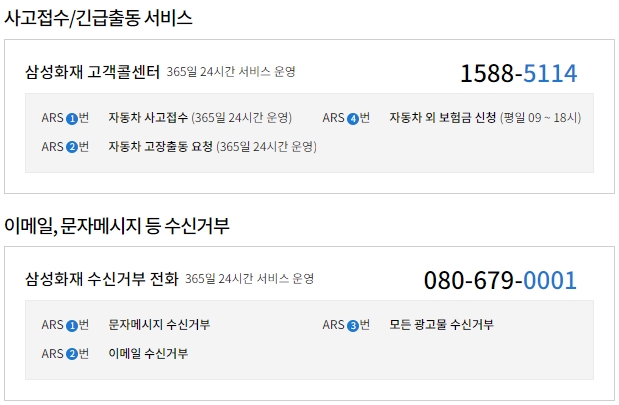 사고접수 및 긴급출동 서비스는 삼성화재 고객콜센터로 연락하시면 되고, 365일 24시간 서비스 운영을 합니다. 이메일이나 문자메시지 등 수신거부를 위한 번호도 있으며, 이역시도 365일 24시간 서비스 운영을 하고있습니다.