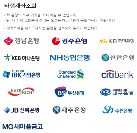 계좌조회를 원하는 은행을 선택하여 조회가 가능하며 경나미 광주, KB국민, 하나, NH농협, 신한, IBK기업, 스탠다드차타드, 시티뱅크, 에버리치, 부산, 대구, JB전북, 제주, MG새마을금고, 수혀은행을 선택하실 수 있습니다.