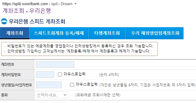 우리은행 스피드 계좌조회 서비스를 이용할 계좌를 사전에 등록하거나 해제할 수 있어요. 공동인증서 로그인 또는 아이디와 비밀번호를 입력하여 로그인합니다. 등록된 계좌에 한하여 2006년 3월 2일부터