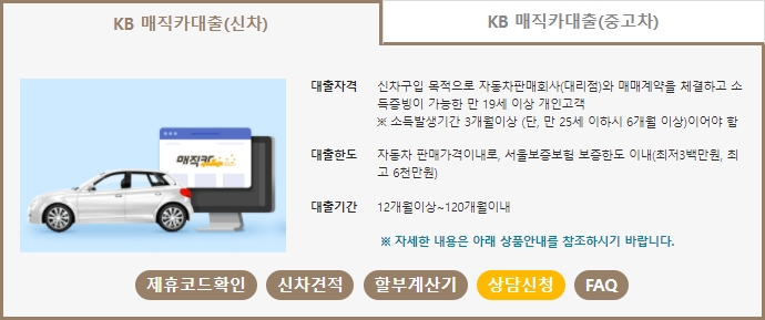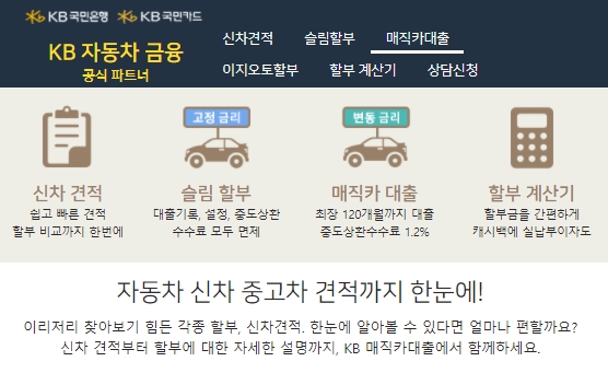 이리저리 찾아보기 힘든 각종할부, 신차견적을 한눈에 알아볼 수 있다면 정말 편리할겁니다. 신차 견적부터 할부에 대한 자세한 설명까지 KB 매직카대출에서 함께해보시기 바랍니다. 그럼 신차상품 먼저 보겠습니다.
