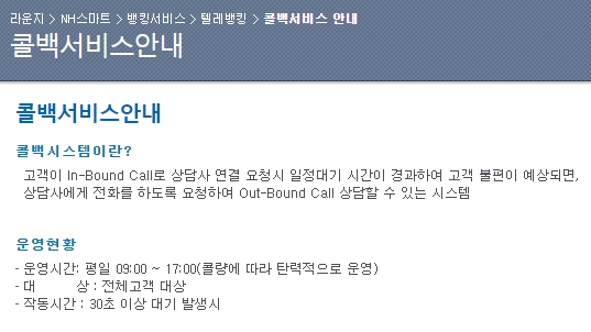 콜백시스템은 고객이 인-바운드 콜로 상담사 연결 요청시 일정 대기시간이 경과하여 고객불편이 예상될 경우, 상담사에게 전화를 하도록 요청하여 아웃-바운드 콜 상담을 할 수 있는 시스템입니다. 운영시간은 평일 09시부터 17시까지이고, 콜량에 따라서 탄력적으로 운영됩니다. 전체고객을 대상으로 하고, 30초 이상 대기 발생시에 작동합니다.