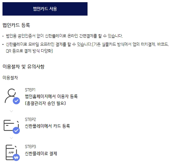 법인용 공동인증서 없이 신한플레이로 온라인 간편결제를 할 수 있는데요, 모바일 오프라인 결제를 할 수 있으며 기존 실물카드 방식에서 앱의 터치결제나 바코드 및 QR코드 등으로 결제방식이 다양해졌습니다. 이용절차는 법인홈페이지에서 이용자 등록을 먼저 해야하는데요, 총관관리자 승인이 필요합니다. 그다음은 신한플레이에서 카드등록을 하고 결제하시면 됩니다.