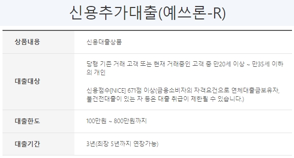 다음은 신용추가대출 상품입니다. 당행 기존거래고객 또는 현재 거래중인고객 중 만20세 이상 ~ 만35세 이하의 개인을 대상으로 하며, 신용점수가 나이스를 기준으로 671점 이상이어야 합니다. 금융소비자의 자격요건으로 연체대출금보유자 및 불건전대출이 있는자 등은 대출취급이 제한될 수 있으니 유의하세요. 대출한도는 1백만원~8백만원까지이며, 대출기간은 3년 및 최장 5년까지 연장이 가능합니다.
