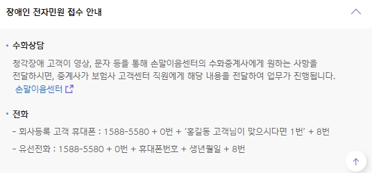 청각장애 고객이 영상이나 문자 등을 통하여 손말이음센터의 수화중계사에게 원하는 사항을 전달하시면, 중계사가 보험사 고객센터 직원에게 해당내용을 전달하여 업무가 진행됩니다. 전화는 회사등록 고객 휴대폰의 경우와 유선전화로 구분하여 안내하고 있으니 참고하세요.